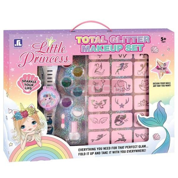 Zestaw składa się z cieni do powiek umieszczonych w zegarku i pędzelka do nakładania ich oraz 16 wzorów tatuaży wraz z błyszczącym pyłem do nich. Wymiary opakowania: 42.2 x 4.5 x 33.7 cm