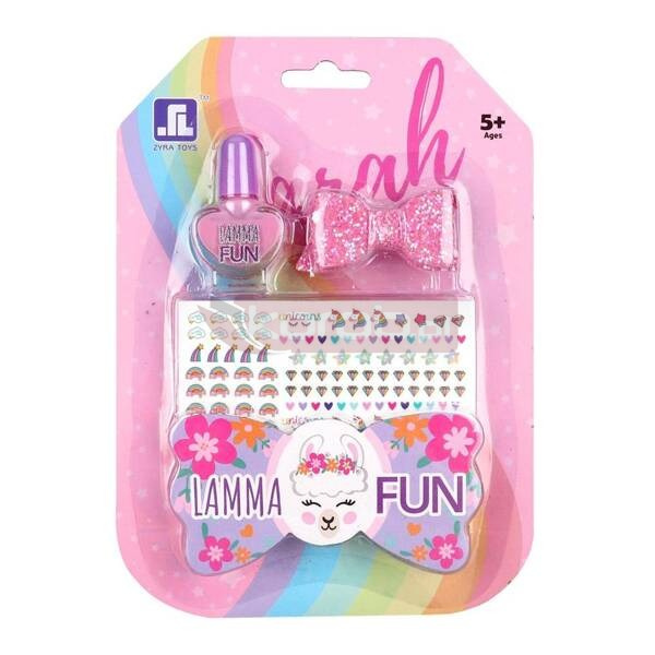 Zestaw składa się z lakieru i naklejek na paznokcie oraz spinki w kształcie kokardy. Wymiary opakowania: 14,1 x 2 19,6 cm.