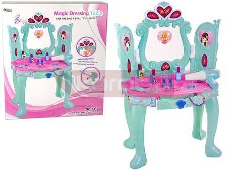 Zestaw Piękności Toaletka Akcesoria Miętowa Witaj w świecie uroku i kreatywności dzięki naszej uroczej miętowej toaletce o wymiarach 73 cm x 43.5 cm x 31.5 cm! Dopracowane detale zachwycają każdego, kto marzy o magicznej przemianie. Toaletka wykonana z najwyższej jakości tworzywa sztucznego, a subtelne różowe akcenty nadają jej dziewczęcego wdzięku i uroku. Ten zestaw to prawdziwy salon piękności w miniaturowej wersji! W zestawie znajdziesz pełen zestaw akcesoriów, które zachwycą każdą małą artystkę kosmetyczną: niebieską suszarkę (16 cm x 13 cm x 5 cm) działającą na baterie 1.5V AA ( brak w zestawie ) , niebieski grzebień, uroczy różowo-niebieski naszyjnik i bransoletkę, trzy buteleczki ozdobione brokatem (możesz je samodzielnie wypełnić, np. perfumami), a także dwie plastikowe szminki, które dodają dodatkowej zabawy. Po dotknięciu przycisku w kształcie serca znajdującego się nad lustrem, zacznie grać przyjazna melodia, a twarz dziecka zostanie oświetlona. Razem z dźwiękiem i światłem, toaletka zacznie się otwierać, ukazując lustro. Nie zapomnieliśmy o wyobraźni! W zestawie znajdziesz także kreatywne naklejki, które umożliwiają personalizację toaletki, by pasowała do Twojego stylu. To również doskonały pomysł na prezent dla młodych artystek kosmetycznych! Całość mieści się w opakowaniu o wymiarach 44 cm x 12 cm x 51 cm, gotowym do przygody i zabawy. Odkryj niezliczone możliwości twórczej eksploracji dzięki naszej urokliwej miętowej toaletce! Wymiary toaletki: 72 cm x 43 cm x 32 cm Wymiary opakowania: 44 cm x 12 cm x 51 cm Posiada certyfikat CE, ponadto jest zgodny z normą EN71. Zabawka przeznaczona jest dla dzieci powyżej 3 roku życia.