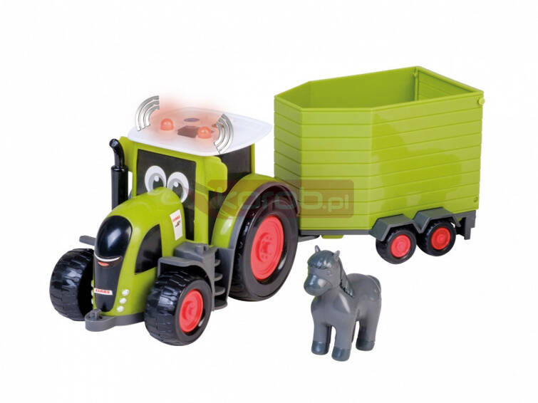 W zestawie Traktor Class Kids znajduje się pojazd traktora i przyczepa, a także figurka konia. Traktor i przyczepa są w kolorze zielonym z kołami w kolorze czarnym z czerwonymi dodatkami. Do zestawu dołączona jest figurka konia, która z powodzeniem mieści się w przyczepie. Po naciśnięciu odpowiedniego przycisku na kabinie, traktor wydaje dźwięk silnika, a także zapalają się światła ostrzegawcze. Transporter do przewozu konia ma otwieraną tylną klapę, a cały zestaw ma ok. 28 cm długości. Swoimi słodkimi oczkami pojazdy CLAAS Mini oczarowują najmłodszych i wywołują uśmiech na ich twarzach. Zabawka jest przyjazna dla dzieci dzięki zaokrąglonym rogom i krawędziom i idealnie pasuje do rączek małych dzieci.