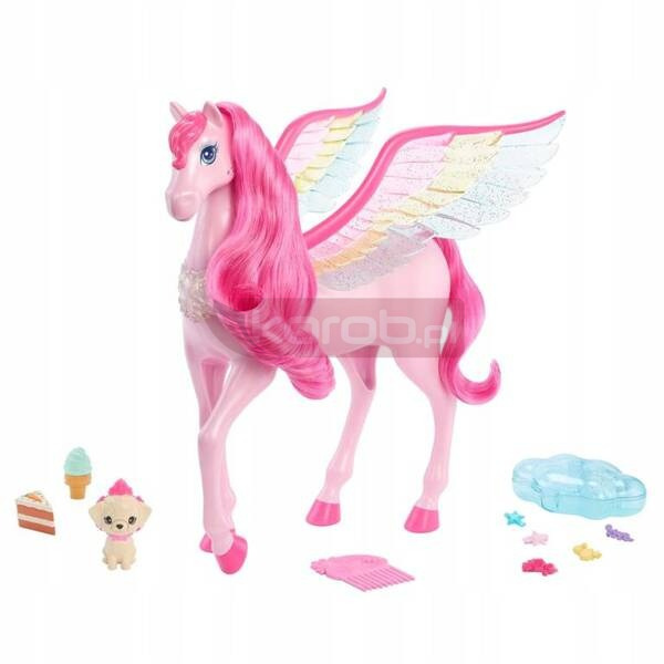 Zainspirowany przygodami z filmu Barbie Szczypta magii, ten magiczny pegaz jest wyposażony w dziesięć różnych akcesoriów oraz funkcje świetlne i dźwiękowe! Barbie Pegaz ma jaskraworóżową grzywę i ogon, a także błyszczące, tęczowe skrzydła! Jej pokazy świetlne i dźwiękowe aktywowane są na trzy różne sposoby. Dzieci mogą nacisnąć jej naszyjnik lub poruszyć skrzydłami, aby zobaczyć tęczowe światła i usłyszeć magiczne dźwięki, w tym piosenkę przewodnią Barbie: Szczypta magii. Następnie mogą zaspokoić jej apetyt na słodycze lodami i ciastem marchewkowym, słuchając, jak przeżuwa i rży! W zestawie dziesięć akcesoriów: przyjaciel szczeniaka z magiczną niespodzianką w kształcie skrzydła, dwie przekąski, grzebień, pięć spinek i świecące pudełko do przechowywania chmurek ułatwiające czyszczenie. Zabawki i lalki Barbie Szczypta magii to czarujący prezent dla dzieci w wieku od 3 lat. Świetny prezent dla fanów Barbie.