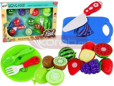 Zestaw Owoców Do Krojenia Talerzyk Sztućce Ten wyjątkowy zestaw oferuje wysokiej jakości plastikowe owoce, takie jak truskawka, winogrono, kiwi, melon, arbuz i jabłko. Owoce można przepołowić i złączyć na rzep, a dołączony nóż pozwala na ich rozcięcie na pół, doskonaląc umiejętności krojenia w sposób bezpieczny i kreatywny. W zestawie znajdziesz także praktyczne dodatki, takie jak zielony talerzyk o średnicy 13 cm, niebieska deska do krojenia (13 cm x 8 cm), zielona łyżka (12 cm) oraz czerwono-biały widelec i nóż (13 cm). Wszystkie elementy są starannie zaprojektowane z myślą o bezpieczeństwie i edukacyjnej zabawie. Optymalne wymiary atrakcyjnego opakowania to 26 cm x 37 cm x 6 cm. Ten zestaw to nie tylko sposobność do rozwijania umiejętności manualnych, ale także świetna okazja do nauki o różnorodności owoców. Zachęcamy do eksplorowania świata owoców i wspaniałej zabawy w wirtualnej kuchni! Elementy zestawu: - 6 owoców na rzep - deska do krojenia - talerzyk - sztućce Wymiary opakowania: 26 cm x 37 cm x 6 cm Posiada certyfikat CE, ponadto jest zgodny z normą EN71. Zabawka przeznaczona jest dla dzieci powyżej 3 roku życia.