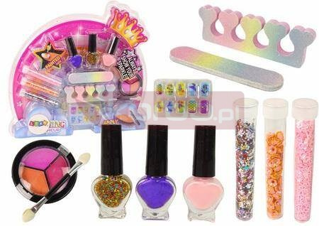 Zestaw Do Makijażu Zdobienie Paznokci Tęcza Zestaw piękności, który zapewni niezapomnianą zabawę w tworzenie stylizacji. W zestawie znajdziesz trzy lakiery do paznokci w odcieniach różowego, fioletowego i brokatowego, aby zdobić paznokcie według swojego gustu. Separator kosmetyczny i pilniczek zapewnią doskonałe przygotowanie paznokci. Dodatkowo, zestaw zawiera cienie do powiek w trzech kolorach: różowym, pomarańczowym i czerwonym, pozwalając na eksperymentowanie z różnymi makijażami oczu. Tipsy z uroczym motywem syrenki dodadzą oryginalności. Trzy pojemniczki z ozdobnym brokatem w kształtach serduszek, kwiatów i gwiazdek umożliwią tworzenie efektownych zdobień na paznokciach i makijażu. Nie zabraknie też pacynki do nakładania cieni do powiek, ułatwiającej tworzenie profesjonalnego efektu. Całość zapakowana jest w przezroczyste opakowanie w kształcie tęczy o wymiarach 28 cm x 27 cm x 4 cm, co czyni go atrakcyjnym prezentem. Zapraszamy do twórczej zabawy i eksperymentowania z różnymi stylami! Elementy zestawu: - 3 lakiery do paznokci - pilniczek - cienie do powiek - pacynka - separator kosmetyczny - tipsy - 3 opakowania z ozdobnym brokatem Wymiary opakowania: 28 cm x 27 cm x 4 cm Posiada certyfikat CE, ponadto jest zgodny z normą EN71. Zabawka przeznaczona jest dla dzieci powyżej 3 roku życia.