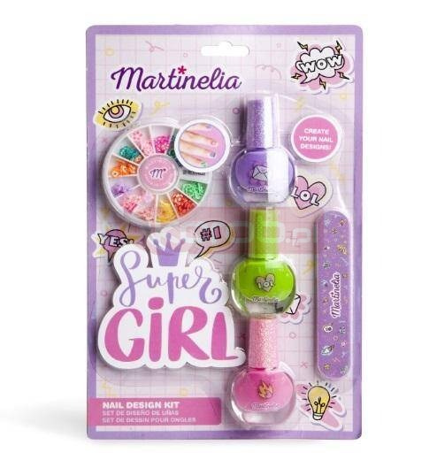 Zestaw kosmetyków do paznokci dla dzieci zawiera: 3 lakiery do paznokci, zestaw ozdób do paznokci, pilnik, patyczek do paznokci.