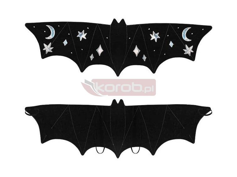 Strój - skrzydła nietoperza w kolorze czarnym ze srebrnymi elementami. Przeznaczony dla dzieci w wieku 3 - 7 lat.