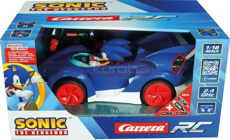 Rozpalone do czerwoności wyścigi z mocą bohaterskiego jeża! Metaliczny, niebiesko-biały samochód wyścigowy ma również części do tuningu, które nadają mu ekstrawagancki wygląd. Teraz Sonic jest gotów pokazać każdemu przeciwnikowi, dlaczego jest najszybszym jeżem na świecie. Dołączone są również naklejki, które umożliwiają kierowcom stworzenie własnego, spersonalizowanego wyglądu. Stylowy samochód Sonic jest wyposażony w reflektory LED, dzięki czemu przyciąga wzrok podczas każdego wyścigu. Akumulator LiFePo4 i baterie dołączone do zestawu oznaczają, że kierowcy w wieku od 6 lat mogą ścigać się do 20 minut; a koncept Ready-to-Run oznacza: rozpakuj i gotowe! Technologia: 2,4 GHz. Pełna funkcjonalność. Czas jazdy: 20 minut. Czas ładowania: 50 minut. Konfiguracja: Gotowe do jazdy. Ładowarka zawiera: kabel USB 500mA. Skala: 1:18. Akumulator (szt.): 1 x 3,2V 700mAh 1S LIFEPO4. Długość: 27,2 cm. Prędkość do 9 km/h. Inne informacje o produkcie: RC Cart, oryginalna licencja, dekoracyjne naklejki, światła LED, pełna funkcjonalność, mechanizm różnicowy, akumulator LiFePo4 o długiej żywotności, Extra Fast 0,5A kabel ładujący USB, opony pneumatyczne. Zawartość opakowania: samochód i kontroler, akumulator, kabel ładujący USB 0,5A i baterie do kontrolera 2 x AAA LR03, naklejki. Wiek: 6+.