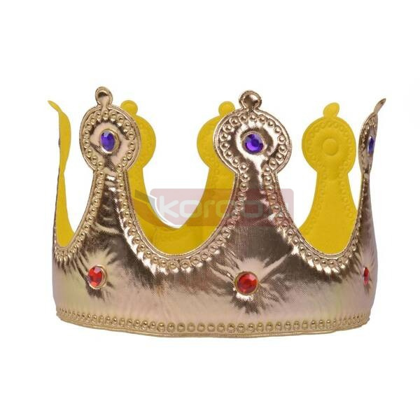 Złota korona z kamyczkami wykonana z błyszczącego materiału zapinana na rzep. Rozmiar: 56 x 12 cm