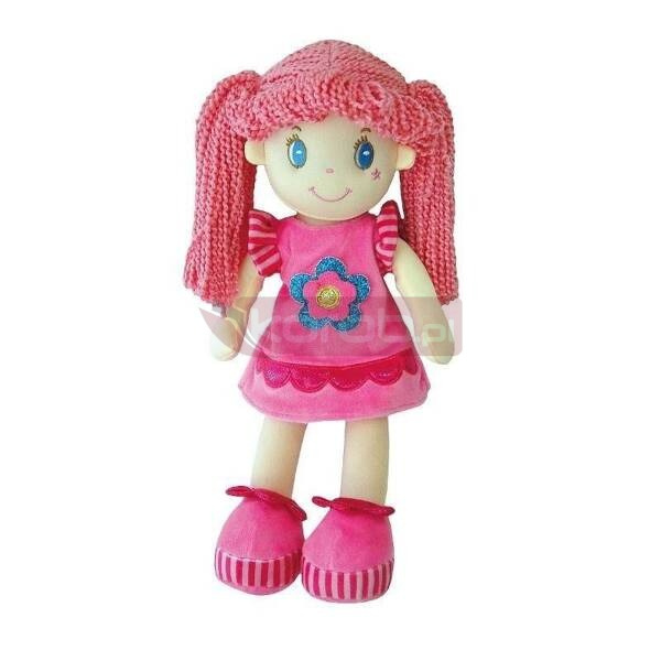 Miękka lala ma na sobie kolorowe ubranko i długie kolorowe włosy. Dziewczynka, która zaopiekuje się szmacianką nauczy się: