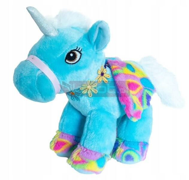 Pluszowy, kolorowy jednorożec to radość dla każdego maluszka. Maskotka ma tęczowe kopyta i skrzydła a na głowie miękki róg.