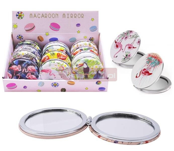 Lusterko podwójne okrągłe rozkładane z obrazkiem flaminga. Średnica: 7cm.