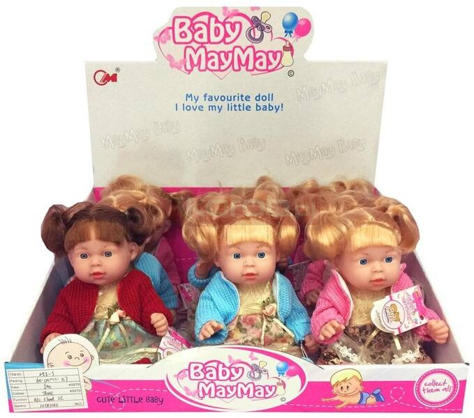 Lalka dziewczynka z głosem. 2 kolory włosów, 3 kolory ubranek. Wysokość: 27cm.