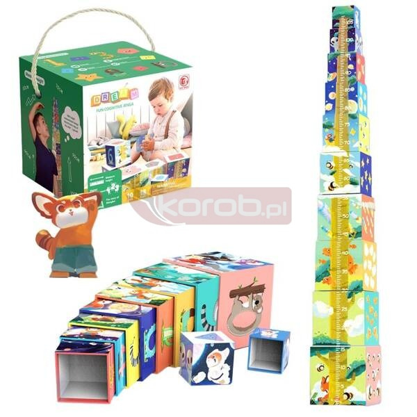 10 kwadratów kartonowych, które należy ułożyć od największej do najmniejszej, jednocześnie dopasowując boki do właściwych wzorów.