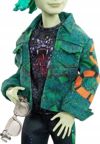 Najpopularniejsze – i najbardziej przerażające! – Uczniowie Monster High budzą się do nowego życia – z zadziwiająco fantastycznymi strojami i akcesoriami, które podkreślają wyjątkowość każdej figury. Z koszulką z nadrukiem, kurtką z wyściółką i spodniami wężowymi, Deuce Gorgon jest modnym hitem. Przyciemniane okulary przeciwsłoneczne i strasznie wspaniałe trampki dopełniają całości. Kto ma węże jako włosy, powinien być dobrze ułożony. Dlatego Deuce Gorgon ma na szczęście tygiel z woskiem wężowym, aby nadać jej charakterystyczną fryzurę. Fioletowa torba na pasek do przechowywania akcesoriów potworów: fartuch z łuskowaty na warstwę w Coffin Bean, dekoracyjna butelka na wodę, telefon komórkowy z wężem i babeczka do energii w podróży! Mała, ale o wielkim wzroście: Domowa Myszka Perseus jest wiernym towarzyszem wszystkich przerażających i wspaniałych przygód. Świetny prezent dla fanów Monster High.