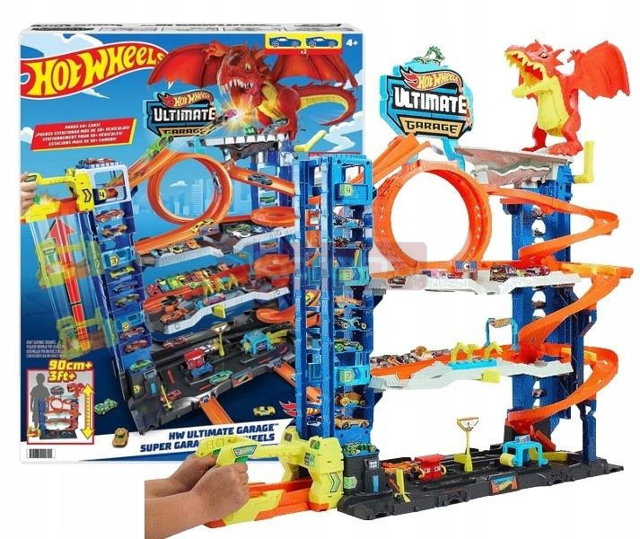 Poznaj wszystkie cztery poziomy wyścigów, akrobacji i opowiadania historii w garażu Hot Wheels City Ultimate. Każdy poziom inspiruje do przygód na torze, w tym wyścigów obok siebie, akrobacji w pętli i epickiej bitwy ze smokiem zjadającym samochody. Zestaw zawiera dwa pojazdy Hot Wheels i zapewnia miejsce parkingowe dla ponad 50 samochodzików w skali 1:64. Można go także łączyć z innymi zestawami, dzięki czemu dzieci mogą budować swoje miasto Hot Wheels. Ścigaj się, akrobuj i walcz ze smokiem w wielopoziomowym garażu Hot Wheels City Ultimate Na pierwszym piętrze znajdują się fajne detale do zabawy na torze, takie jak ruchome węże, myjnia samochodowa z piankowym wałkiem, przełączniki i złącza umożliwiające połączenie z innymi zestawami w ramach większego miasta Hot Wheels. Wjedź dwusamochodową windą na wyższy poziom, gdzie dzieci mogą uruchomić dwa dołączone samochodziki Hot Wheels prosto z windy i wziąć udział w wyścigu obok siebie Na trzecim poziomie wykonaj akrobacje w pętli obok siebie, regulując objazdy, aby zmienić ostateczne miejsce docelowe samochodów Na 4. poziomie czeka głodny samochodów smok, a dzieci uruchamiają swoje Hot Wheels, aby go pokonać, bo w przeciwnym razie zostaną zjedzone. Zjedzone samochody zostają „wyrzucone”, a pokonany smok spada na dno garażu W zestawie znajdują się 2 autka