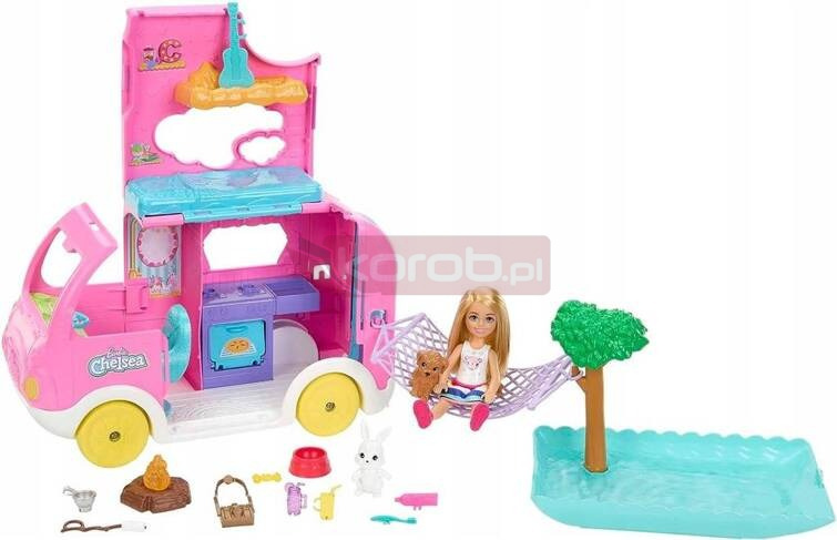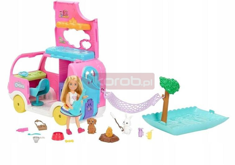 LALKA BARBIE CHELSEA WAKACYJNY KAMPER + piesek króliczek akcesoria HNH90