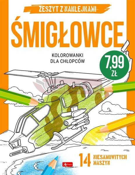 KOLOROWY LOT WOJSKOWYMI ŚMIGŁOWCAMI Oto nie lada gratka dla chłopców - czternaście kolorowanek z wojskowymi śmigłowcami. Black Hawk i Kiowa, Boeing Chinook i Little Bird, Bell Griffon - to tylko niektóre z wiernie odtworzonych modeli do pokolorowania. Sikorsky Super Stallion rozwija zawrotną prędkość 315 km/godz. Eurocopter Caracal jest jeszcze szybszy, może też zabrać na pokład duży ładunek. Sikorsky Sea King wyląduje na lądzie i na wodzie. Apache lata nawet przy całkowitym braku widoczności. Eurocopter Tiger i Bell Super Cobra mają charakterystyczne wąskie kadłuby. Polskie śmigłowce reprezentują Puszczyk i Sokół. Do każdego ze śmigłowców dodano naklejki: sylwetki, flagi lub symbole różnych rodzajów sił zbrojnych. KREDKI W DŁOŃ I W GÓRĘ!