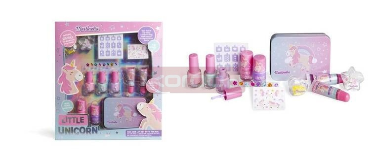 Zestaw kosmetyków dla dzieci zawiera: 5 lakierów do paznokci, 2 błyszczyki do ust , szablony, naklejki, metalowe pudełko.