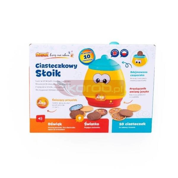 Słoiczek - łakomczuszek potrzebuje ciasteczek! Zabawka głośno liczy wrzucane do środka zabawkowe ciastka, od 1 do 10. Gdy maluch poradzi sobie z tym zadaniem, może otworzyć klapkę, znajdującą się z tyłu słoika, aby wyjąć smakołyki i rozpocząć zabawę od nowa. Gdy naciśniemy przycisk z nutkami, zaświeci się on, a słoiczek zaśpiewa wesołą piosenkę o ciasteczkach. Zabawka jest dwujęzyczna, więc gdy dziecko opanuje już liczenie w języku polskim, może przełączyć się na zabawę w języku angielskim. Produkt przeznaczony jest dla dzieci od 12 miesiąca życia