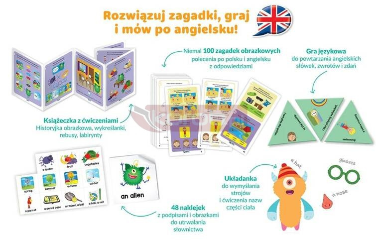 Zagadki obrazkowe zapewniają aktywną naukę słownictwa związanego z zainteresowaniami dziecka. Łączenie rysunków z podpisami, wyszukiwanie niepasujących elementów czy łączenie przeciwieństw rozwija umiejętność rozumienia poleceń, wprowadza do nauki czytania oraz kształtuje umiejętność myślenia logicznego. Na odwrocie karty znajdują się polskie tłumaczenia poleceń wraz z odpowiedziami.