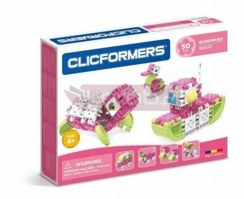 Zestaw zawiera: 10 klocków CLICFORMERS białych 10 klocków CLICFORMERS ciemno-różowych 2 klocki sześciokątne białe 2 klocki łuki zielone 4 trójkątne klocki zielone 4 białe kółka 2 osie 2 żółte daszki 2 żółte półkola 12 zaślepek białych 2 patyczki do otwierania