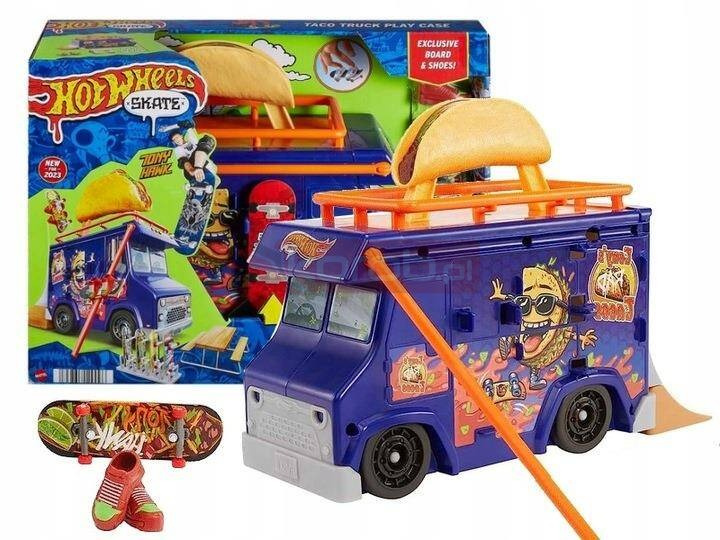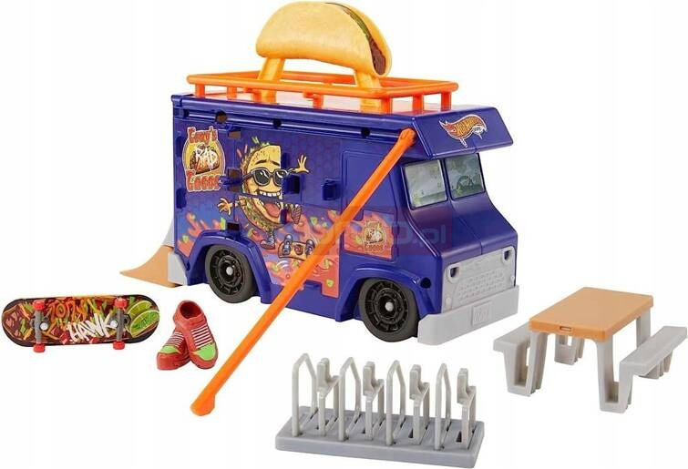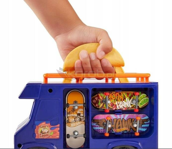 Przeżyj bajeczną jazdę na deskorolce z ciężarówką Hot Wheels Skate Taco W przypadku tej szalonej ciężarówki z rzucającymi się w oczy detalami na dachu znajduje się taco, który może być używany do imponujących sztuczek lub jako uchwyt, gdy ciężarówka jest zabierana ze sobą Poręcz do mielenia jest wysuwana, pionową rampę można postawić, a stół piknikowy można wykorzystać do innych sztuczek skate; wszystkie akcesoria pasują do wygodnego przechowywania w lub na ciężarówce W pełni zmontowana, ekskluzywna deska na palce zaprojektowana razem z legendą skateboardową Tony Hawk oraz zdejmowane buty deskorolkowe, które można przechowywać na ciężarówce, są zawarte w zestawie Na zewnętrznej stronie ciężarówki można przechowywać do 6 desek; miejsce do przechowywania dodatkowych desek i butów skate znajduje się z tyłu ciężarówki; (dodatkowe deski i buty są sprzedawane oddzielnie)