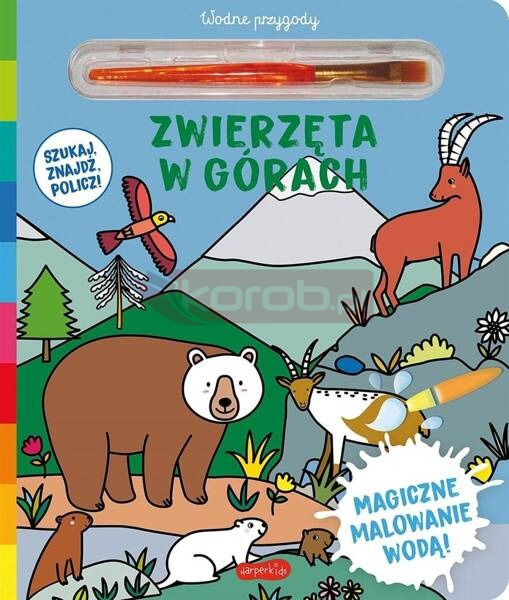 Zwierzęta w górach to kolejny, nowy tytuł w serii Wodne Przygody Akademii Mądrego Dziecka. Na kartonowych stronach książeczki zobaczymy jaka roślinność porasta zbocza gór oraz jakie zwierzęta zamieszkują tereny górskie. Zwierzęta w górach to magiczna kolorowanka, która "pokazuje" swoje kolory, gdy dziecko zanurzy pędzelek w wodzie i pomaluje białe miejsca na stronie. Magicznie pojawiają się różne barwy. Gdy obrazek wyschnie, kolor zniknie i możemy rozpocząć zabawę od nowa. Oprócz zabawy w malowanie, na każdej stronie znajdziemy krótkie polecenie do wykonania, czyli zabawę w "szukaj, znajdź i policz": "Ile widzisz ptaków?" czy "Policz muflony". W serii Wodne Przygody Akademii Mądrego Dziecka ukazały się do tej pory: Przyroda, Dinozaury, Jednorożce oraz Moje święta.