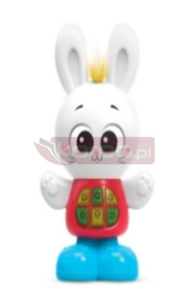 Wesoły, rozgadany króliczek wie jak zainteresować najmłodszych! Zna aż 25 różnych dźwięków i melodii, w tym nawet edukacyjną piosenkę. Poszczególne funkcje aktywują świecące przyciski, znajdujące się na króliczym brzuchu. Głowę zwierzaka zdobi żółta czuprynka z sensorem dotyku. Gdy dotkniemy jej, aktywujemy zabawne dźwięki. Króliczek posiada sprężyste nóżki, co umożliwia przyciśnięcie go, której to czynności towarzyszy odgłos sprężynowych podskoków.