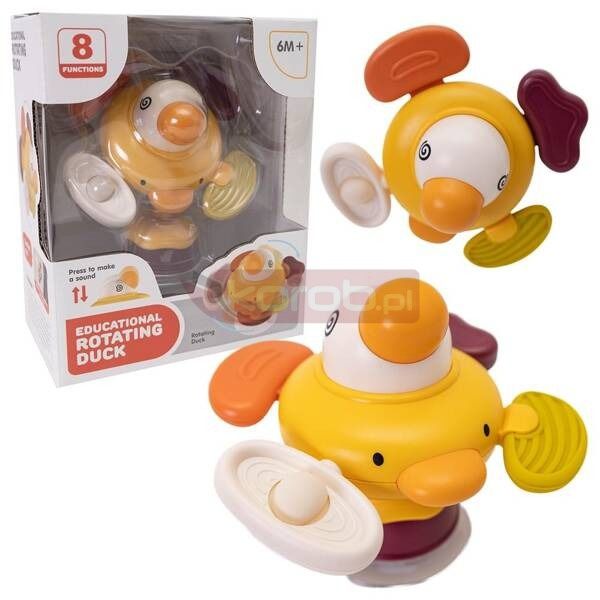 8 funkcyjna zabawka. Może być za pomocą przyssawki przyklejona do szyby, stolika, lustra i wówczas kręci się wokół swojej osi. Przy potrząsaniu grzechocze, naciskając głowę kaczuszki usłyszymy dźwięki. 4 ruchome sensoryczne wypustki o różnych fakturach, kolorach i kształtach. Jedna przesuwa się w pionie i poziomie wydając dźwięki, druga obraca się o 360 stopni i można silikonowy guziczek przepychać paluszkiem w górę i w dół, trzecia i czwarta oprócz tego, że są silikonowymi gryzakami można je wysuwać i wsuwać.