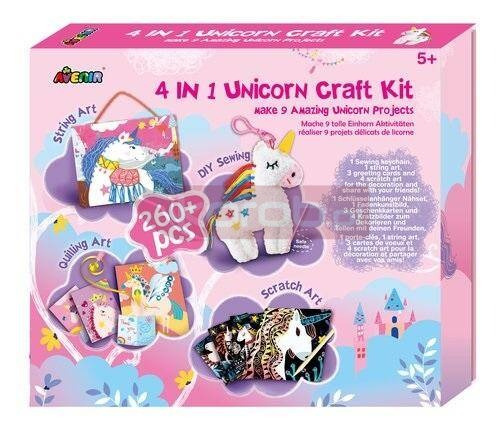 Zestaw jednorożec Avenir 4 w 1 zawiera to, co najlepsze dla dzieci - szycie, przeplatankę, sztukę quilingu oraz wydrapywanki, dzięki czemu dzieci mogą wybierać swoje ulubione zajęcia z jednego dużego zestawu.Opierając się na popularnym motywie jednorożca, dzieci mogą stworzyć breloczek, kartki z życzeniami i obrazki zdrapki. W zestawie 9 projektów jednorożców, dzięki którym dzieci udekorują swój pokój, bądź podzielą się nimi z przyjaciółmi.