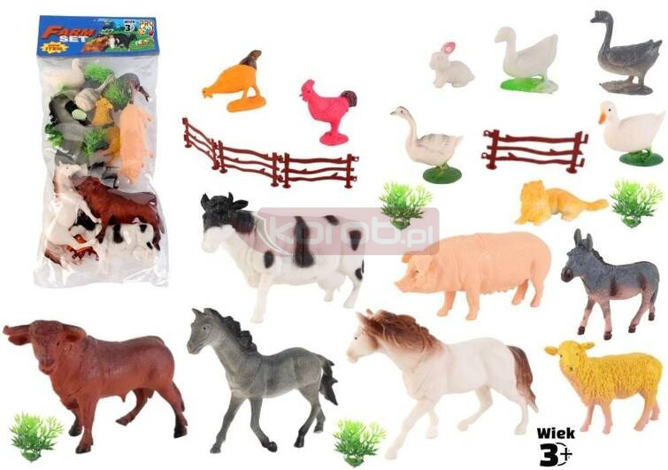 - 15 x figurka tj. krowa, koń x 2, byk, osiołek, świnia, owca, kura, kogut, kaczka x 2, gęś x 2, kot, królik,