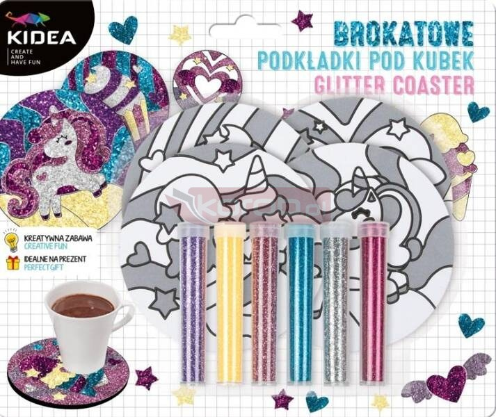 Zestaw kreatywny brokatowe podkładki Bajkowy Świat od Kidea. W zestawie znajdują się 4 podkładki pod kubek z różnymi, bajkowymi wzorami: babeczką, lodami, uskrzydlonym sercem i jednorożcem, oraz 6 kolorów brokatów: dwa odcienie różu, fioletowy, niebieski, złoty i srebrny. Wystarczy zdjąć ochronną naklejkę z wybranego fragmentu podkładki i obsypać ją brokatem, który natychmiast przyklei się do znajdującego się pod naklejką kleju. Zestaw kreatywny pozwala na dowolną zabawę kolorami, rozwijając przy tym wyobraźnię i kreatywność dziecka. Własnoręcznie wykonane brokatowe podkładki będą pięknie wyglądać na stole pod kubkiem z gorącym lub zimnym napojem. Zestaw sprawdzi się również jako wyjątkowy prezent na każdą okazję.