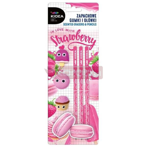 Zapachowy niezbędnik Kidea o słodkim, truskawkowym aromacie, który zawiera 3 ołówki o twardości rysika HB oraz trzy smakowite gumki w kształcie loda na patyku, makaronika i babeczki. Średniej twardości rysik i trójkątny kształt sprawiają, że ołówki są poręczne i wygodne w użyciu.