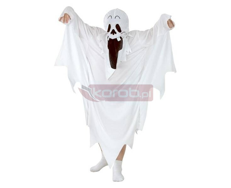 STRÓJ DLA DZIECI "DUCH" Rozmiar 120/130 cm Długość całkowita: 109 cm Szerokość pod pachami: 49 cm Długość rękawa: 45 cm Materiał: 100 % poliester. Strój zawiera dodatkowo: kaptur.