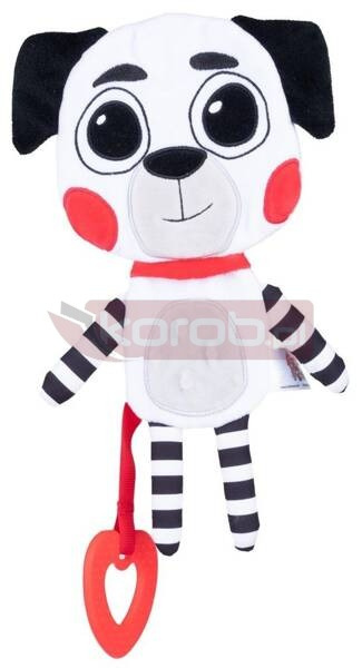 Milutki psiak stworzony do tulenia. Jego ciałko uroczo szeleści, a zróżnicowane faktury materiałów, z których został wykonany, wspomagają rozwój zdolności poznawczych dziecka. Zabawkę zdobi miękki gryzak z wypustkami, który przyniesie ulgę podczas ząbkowania. Wyraziste, kontrastowe kolory zwierzaka stymulują zmysł wzroku malucha już od pierwszych dni jego życia