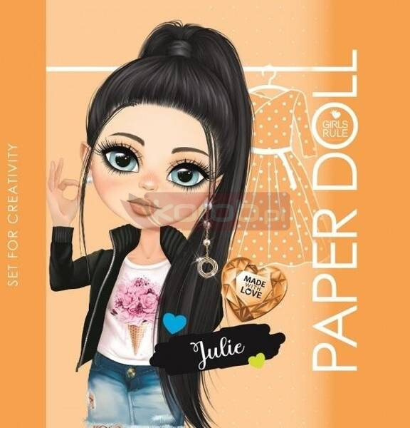 Papierowa lalka do zabawy - Julie. W środku znajdziesz wiele różnych strojów, w które możesz ją przebrać. Pokoloruj ją, a następnie wytnij z książeczki, potem ubierz - zaginając specjalnie zaznaczone krawędzie. Stroje mają wyraźne oznaczenia pokazujące, gdzie wyciąć, aby ubrania pasowały na lalkę. Baw się nimi opowiadając najróżniejsze historie. Potem możesz przebrać lalkę i zacząć zabawę od nowa. Wyprodukowano na Ukrainie.