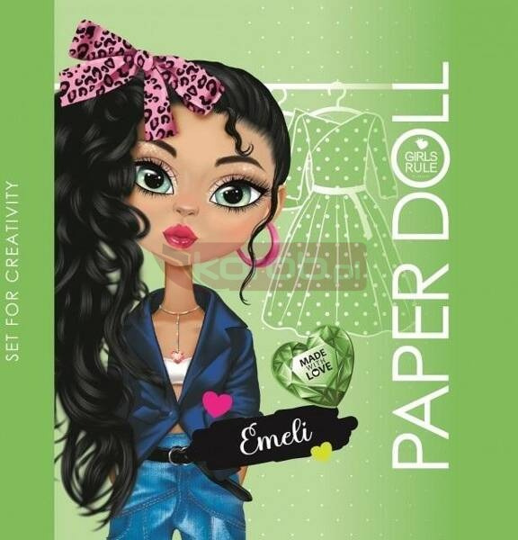 Papierowa lalka do zabawy - Emeli. W środku znajdziesz wiele różnych strojów, w które możesz ją przebrać. Pokoloruj ją, a następnie wytnij z książeczki, potem ubierz - zaginając specjalnie zaznaczone krawędzie. Stroje mają wyraźne oznaczenia pokazujące, gdzie wyciąć, aby ubrania pasowały na lalkę. Baw się nimi opowiadając najróżniejsze historie. Potem możesz przebrać lalkę i zacząć zabawę od nowa. Wyprodukowano na Ukrainie.