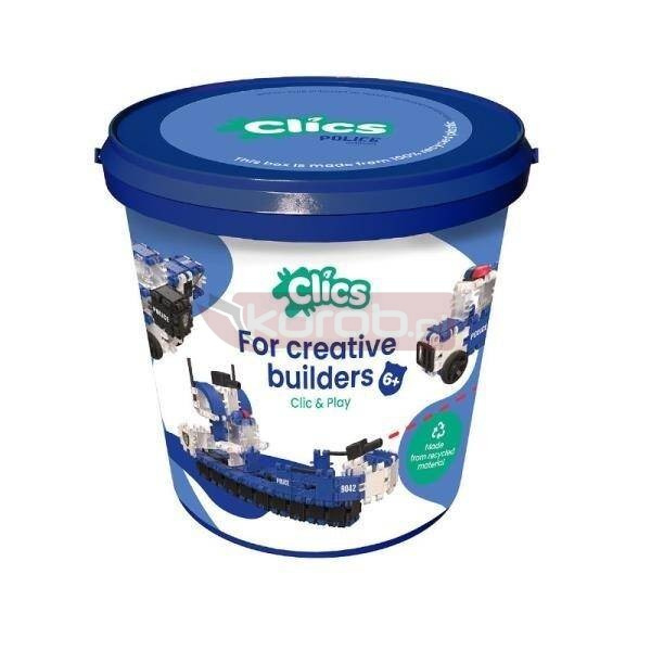 CLICS to edukacyjno-konstrukcyjne klocki dla dzieci od 6 roku życia zapewniające godziny wspaniałej zabawy w budowanie. W opakowaniu znajdziemy 135 elementów klocków, które umożliwiają małym konstruktorom zbudowanie aż ośmiu rodzajów pojazdów Policji. Klocki edukacyjno-konstrukcyjne świetnie sprawdzą się jako prezent dla każdego małego miłośnika budowania. Konstruowanie pojazdów rozwija umiejętności manualne dziecka oraz zdolność logicznego myślenia. Dodatkowo pozytywnie wpływa na rozwój wyobraźni i kreatywności najmłodszych. Wszystkie elementy zestawu zostały umieszczone w praktycznym, plastikowym wiaderku z rączką, dzięki czemu dziecko z łatwością może je przenosić. Cechy produktu: - klocki zwiększają sprawność umysłową, co przekłada się na kreatywność najmłodszych, - pobudzają wyobraźnię oraz pozytywnie wpływają na rozwój dziecka, - świetny prezent dla dzieci uwielbiających budowanie. Zawartość opakowania: - 135 elementów klocków, - 8 planów budowy pojazdów.