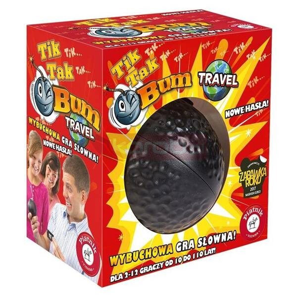 Wybuchowa gra słowna w nowej wersji! Nie dla bojaźliwych! Los każdego gracza wisi na włosku, gdy ta piekielna bomba zaczyna tykać. Trzeba nie lada opanowania, by w takiej sytuacji znaleźć odpowiedni wyraz i pozbyć się bomby, zanim nastąpi wybuch! Kultowa gra Piatnika teraz również w wersji podróżniczej, dzięki czemu można ją zabrać na wakacje, w podróż czy na piknik do parku! Zabawa i emocje gwarantowane! Kreatywność nie lubi się z presją czasu. Czy byłbyś w stanie wymyślić słowo kończące się na dany zlepek liter, trzymając w ręce tykającą bombę, która może wybuchnąć w każdej chwili? Oto genialna w swojej prostocie gra imprezowa, która rozerwie każdego. Gra wymaga opanowania i refleksu, a także ćwiczy kreatywność, spontaniczność i słownictwo. Tik Tak Bum idealnie sprawdzi się na spotkaniach ze znajomymi czy rodziną i zapewni każdemu dużo radości. Teraz dzięki mniejszym gabarytom opakowania, grę można wygodnie zabrać ze sobą na różne wydarzenia. 50 dwustronnych kart zapewnia wiele ciekawych i zabawnych rozgrywek na długi czas. Przez około pół minuty tykająca bomba wystawia graczy na próbę. Losowana jest karta zawierająca kilka liter. Uruchamiany jest mechanizm zegarowy na losowy czas (od 10 do 60 sekund) i pierwszy gracz bierze bombę do ręki. Gracz, na którego przypada kolejka, musi podać wyraz zawierający litery wylosowane na karcie i przekazać bombę sąsiadowi z lewej, zanim nastąpi wybuch! Często wyraz, który wymyślisz oczekując na swoją kolej, zostanie zużyty przez poprzedniego gracza i nawet osoby posiadające bardzo bogaty zasób słów mogą poczuć pustkę w głowie. Proste zasady, maksimum zabawy! Ze wszystkich przetasowanych kart losujemy 10 i układamy je jednym kolorem do góry. Następnie rozpoczynający gracz bierze do ręki bombę, naciska umieszczony na niej przycisk i odwraca wierzchnią kartę. Musi teraz wypowiedzieć wyraz, zawierający podaną na karcie grupę liter. Może ona znajdować się na początku, na końcu lub w środku wyrazu. Nie można jednak zmieniać kolejności liter ani umieszczać innych liter wewnątrz podanej na karcie sekwencji. W grze można używać wyłącznie rzeczowników pospolitych (rozpoczynających się małą literą) w mianowniku liczby pojedynczej. Rzeczowniki nie mające liczby pojedynczej (na przykład spodnie albo widły) mogą być użyte w pierwszym przypadku liczby mnogiej. Tego samego wyrazu nie można użyć dwa razy w tej samej rundzie, natomiast może być użyty w innej rundzie, jeżeli zawiera odpowiednia grupę liter. Wymyśliłeś hasło? Szybko, podaj bombę dalej! Jeżeli udało się wymyślić słowo przed wybuchem bomby, to należy szybko podać ją kolejnej osobie. Powinna ona podać inny wyraz do tych samych warunków. Zabawa trwa do momentu kiedy bomba nie wybuchnie. Wówczas gracz, który w tym momencie trzymał bombę za karę musi zabrać kartę. Przegrany rozpoczyna kolejną rundę, a cała gra kończy się w momencie zużycia wszystkich kart ze stosu. Wygrywa gracz, który zdobył najmniej kart.