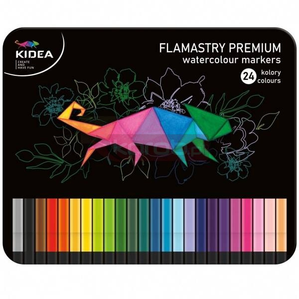 Flamastry w metalowym pudełku od Kidea w aż w 24 intensywnych kolorach w odcieniach czerwieni, żółci, zieleni, niebieskiego, fioletu, różu, brązów i szarości. Flamasty bardzo dobrze kryją a ich kwadratowy kształt ułatwia chwyt i precyzję. Wytrzymałe, metalowe pudełko ułatwia przechowywanie i utrzymanie porządku. Flamastry sprawdzą się do tworzenia prac plastycznych, podkreślania i zakreślania. Będą również świetnym prezentem dla małych artystów.