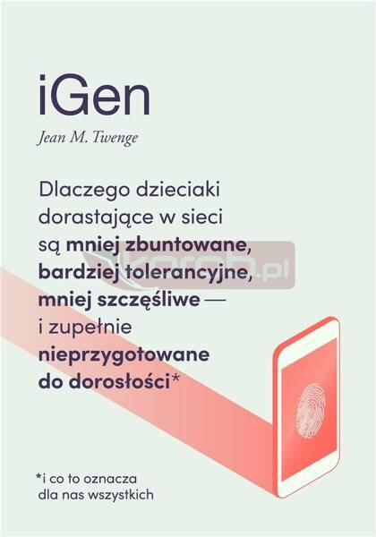 Media społecznościowe i esemesowanie wypierają inne formy rekreacji i komunikowania się - iGen spędza mniej czasu z przyjaciółmi i rodziną, co może wyjaśniać niespotykany dotąd u młodych ludzi poziom lęku, depresji i samotności. Ale technologia to nie jedyna rzecz wyróżniająca tę generację. Korzystając ze swoich obszernych badań, odkrywczych wywiadów i głębokiej analizy danych zgromadzonych od ponad 11 milionów respondentów na przestrzeni kilku dekad, Twenge pokazuje, że wyjątkowość osób z tego pokolenia przejawia się również w sposobie spędzania czasu, zachowaniu, a wreszcie w zaskakującym stosunku do religii, seksualności i polityki.