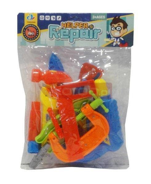 Zestaw podstawowych narzędzi dla małego majsterkowicza jak: wiertarka, młotek, nożyce, klucz, śrubokręt. Produkt zapakowany w przezroczysty worek. Produkt przeznaczony dla dzieci od 3 lat. Podane wymiary są wymiarami produktu w opakowaniu.