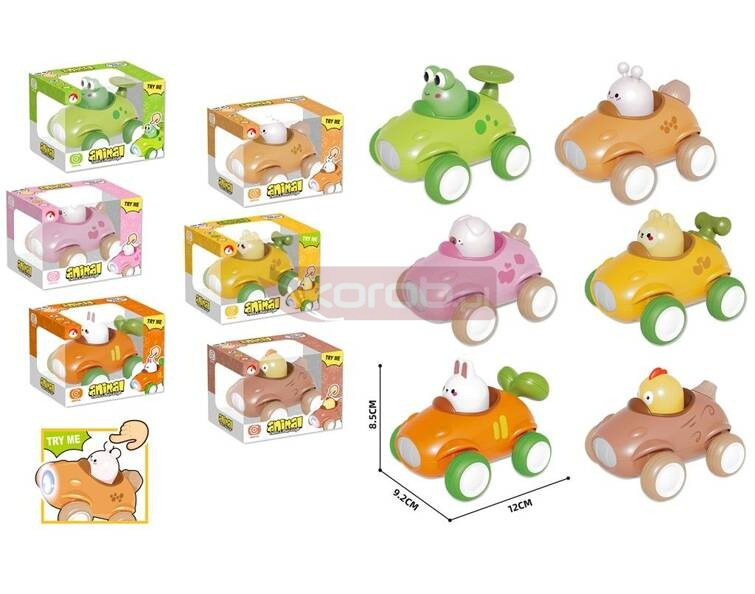 Autko ze zwierzątkiem. Po naciśnięciu zwierzątka, autko jedzie do przodu, gra i świeci.