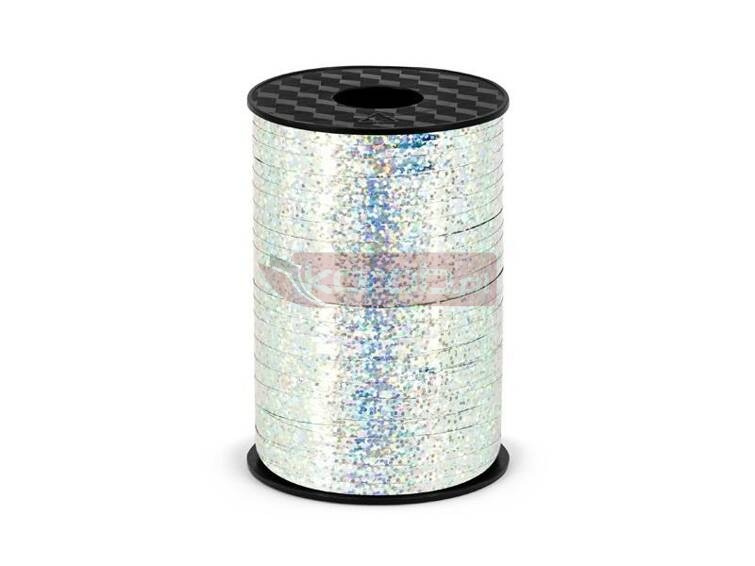 Wstążka plastikowa holograficzna w kolorze srebrnym, szerokość ok. 5 mm, długość ok. 225 m.