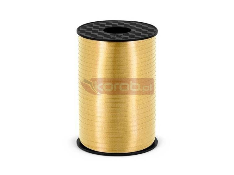 Wstążka plastikowa w kolorze złotym, szerokość ok. 5 mm, długość ok. 225 m.