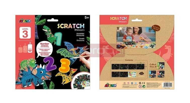 Niesamowicie kolorowa grafika Avenir z pewnością zapewni rozrywkę maluchom. Za pomocą patyczka delikatnie usuwaj czarną warstwę wierzchnią, ukazując kolorowe dinozaury. Zidentyfikuj typy dinozaurów i policz ich przyjaciół!