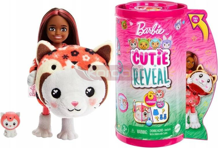 Cutie Reveal to seria lalek w przebraniach słodkich zwierzaków Rozpakowywanie lalek Barbie® Cutie Reveal™ to świetna zabawa dzięki niespodziankom, w tym lalce Chelsea ! W opakowaniu znajdziesz mięciutkiego zwierzaka i torebki-niespodzianki. Gdy zdejmiesz z lalki kostium , odkryjesz pod nim lalkę Chelsea® z długimi włosami oraz lśniącymi detalami. Otwórz torebki-niespodzianki, aby znaleźć ubranko, akcesoria, gąbkę-grzebień i malutkie zwierzątko. Dzieci mogą przebierać lalkę Barbie® i dobierać akcesoria – góra kostiumu po odwróceniu staje się kurtką z niezwykle miękkiego polaru, a głowa kostiumu legowiskiem dla zwierzątka! Ale to jeszcze nie koniec niespodzianek! Czas na transformację ze zmianą koloru. Na twarzy Barbie® pojawia się makijaż inspirowany zwierzątkiem, a jej uroczy zwierzak „otwiera i zamyka” oczy. Aby aktywować zmianę koloru, wystarczy użyć zimnej wody i gąbki-grzebienia. Użyj ciepłej wody, aby wrócić do pierwotnego wyglądu. W serii Barbie® Cutie Reveal™ magicznym zachwytom nie ma końca!