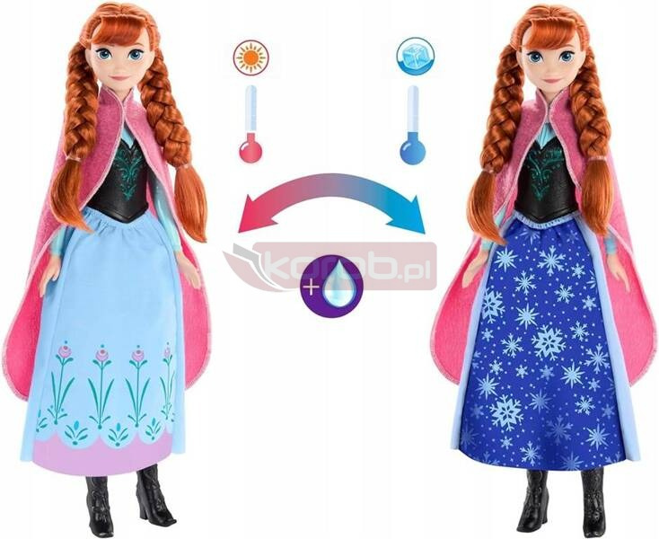 Inspirowana bohaterką filmu animowanego „Kraina lodu” Disneya lalka Anna – Magiczna spódniczka ma na sobie filmowy strój z miękką zmieniającą kolor spódniczką oraz zdejmowanymi bucikami i peleryną. Użyj śnieżynkowej różdżki, przywołaj magię i wyczaruj spektakularną transformację: spódniczka Anny zmieni kolor na niebieski ze ślicznym wzorem płatków śniegu. Za pomocą ciepłej wody wrócisz do poprzedniego wyglądu. Tę magiczną transformację możesz powtarzać w nieskończoność. Włosy Anny, splecione w znane z filmu warkocze, można dowolnie czesać i stylizować. Fani mogą zebrać wszystkie lalki Disney Kraina lodu, aby przeżywać niezliczone magiczne przygody.