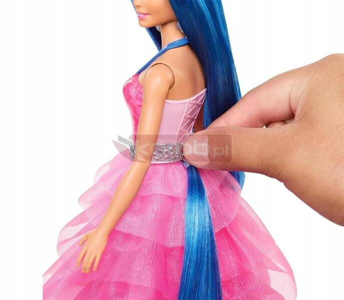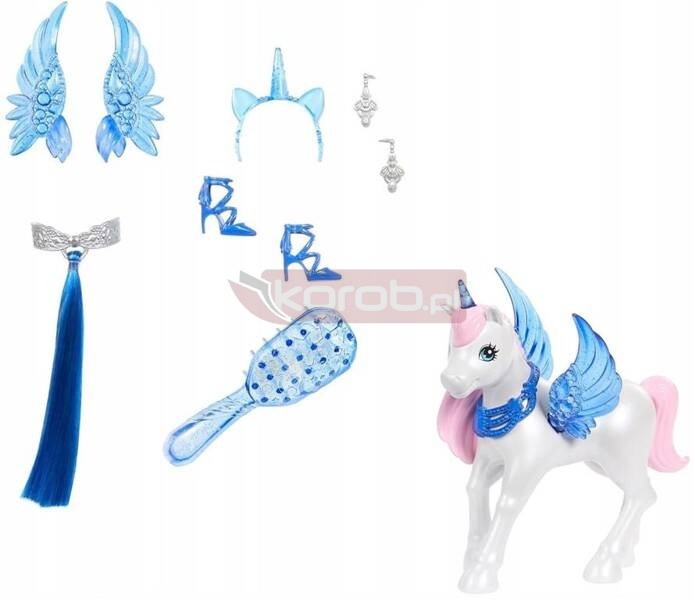 Świętuj 65. rocznicę Barbie® z tą zachwycającą lalką! Lalka – inspirowana postacią z bajki „Szczypta magii” z motywem jednorożca ze skrzydełkami – ma na sobie śliczną różową suknię z efektem ombre. Niebieskie włosy ozdabia jednorożcowa opaska, a bransoletki ze skrzydełkami i odczepiany ogonek nadają stylizacji baśniowego wymiaru. W zestawie są też srebrzyste kolczyki, buciki na obcasie, szczotka do włosów i magiczny jednorożec ze skrzydełkami.