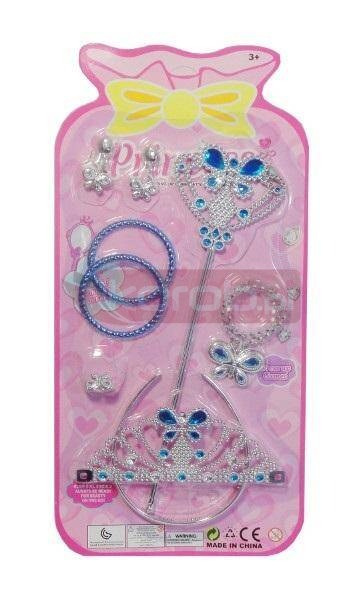 Zestaw biżuterii tiara z różdżką. W zestawie znajduje się także naszyjnik, kolczyki, pierścionek i 2 bransoletki. Wszystko z motywem motyla. Produkt zapakowny w kartonową podstawkę z przezroczystym kloszem. Zabawka dla dzieci od 3 lat. Podane wymiary są wymiarami opakowania.