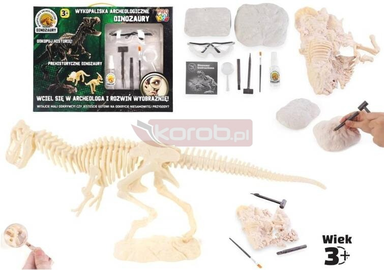 Zestaw dostarcza wszystkie niezbędne narzędzia, aby maluch mógł poczuć się jak prawdziwy archeolog. W zestawie znajdują się okulary ochronne, gipsowa bryła z zatopionym szkieletem, pędzelek, młoteczek, dłuto, buteleczka na wodę i lupa. Dzięki nim dziecko może precyzyjnie wykopywać i rekonstruować szkielety.